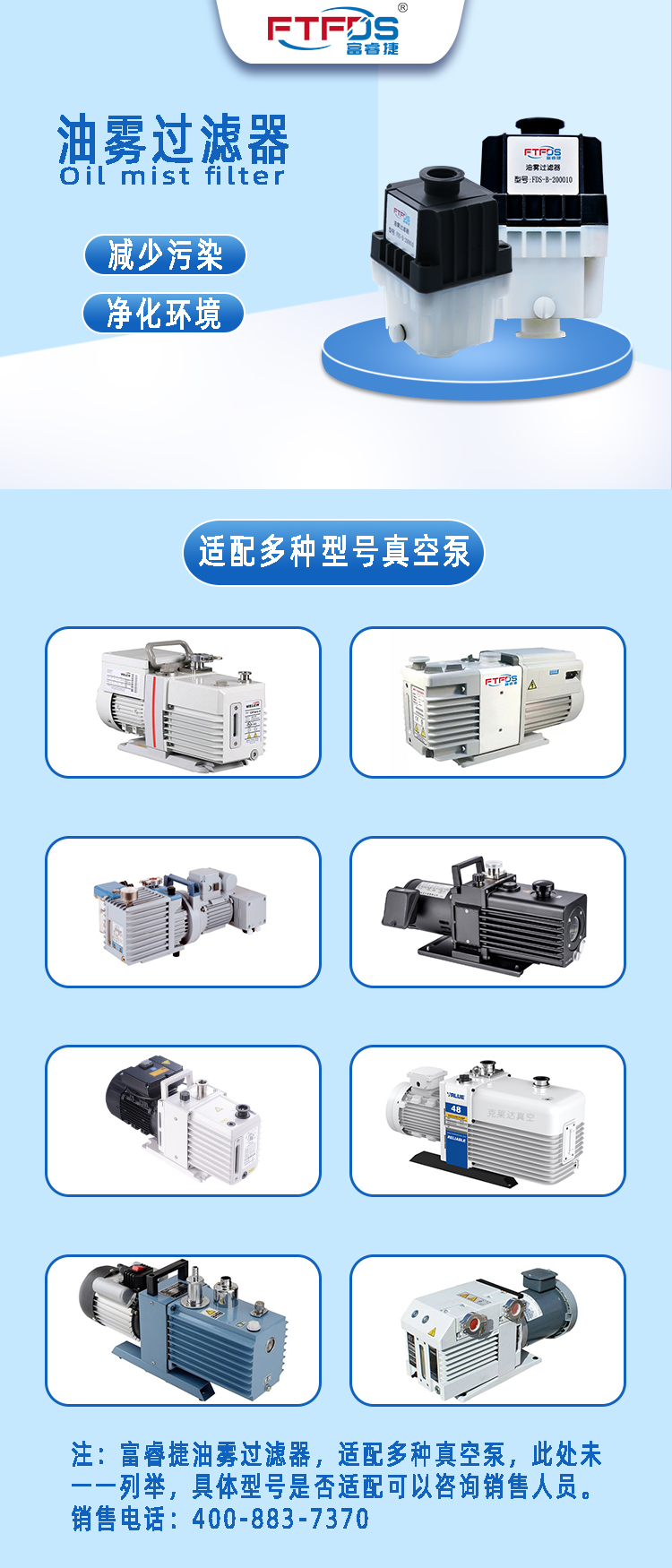真空泵油雾过滤器在推动力的作用下,位于一侧的油气混合物通过真空泵油雾过滤器的滤纸及棉质。油被截留,从而实现气体与真空油的过滤操作过程。被过滤掉的真空泵油随着回油管进行循环利用,排出的则是无油的废气,从而达到无污染,洁净的效果。